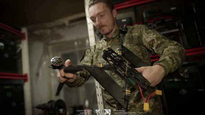 На столі — десятки пластикових деталей різного розміру. Ось корпус для скидного боєприпасу під FPV-дрон. Поруч — кріплення антени для ретранслятора, підігнане під конкретну батарею конкретного пілота. Далі — тримач для дрона-перехоплювача, який полює на “Шахеди”. І невеликий корпус для Starlink-повербанку, що живиться від FPV-батареї на 25 вольт просто в полі. Усе це надруковано тут, у 3D-лабораторії майстерні БпЛА ОПДБр 7-го корпусу ШР ДШВ ЗСУ, за останні кілька годин.